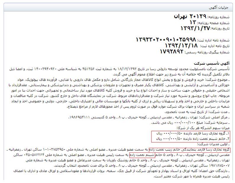 برای یافتن مدیرعامل این شرکت سری به سایت یکپارچه سازی پایگاه آگهی های قانونی می زنیم و شماره ثبت این شرکت را وارد کرده و آگهی های مربوط به این شرکت را بررسی می کنیم. در آگهی تاسیس این شرکت که مربوط به تاریخ 18 اسفند 1393 می باشد، اسم زینب و شبنم نعمت زاده به چشم می خورد. مشخص است که این شرکت متعلق به فرزندان محمدرضا نعمت زاده وزیر سابق صنعت، معدن و تجارت است.